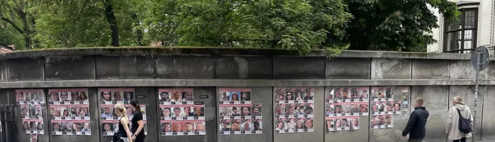 Mauer in Prag an jüdischer Synagoge mit Entführungsopfern des 7. Oktobers.