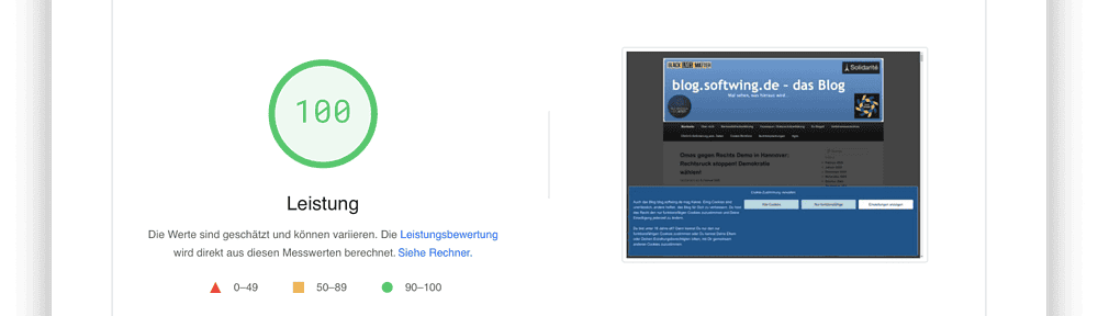 Die Werte für die Desktopvariante sind gut. Bei Mobile knickt die Performance der Seite etwas ein. Das liegt an den 1/2 Bildetn des letzten Posts, die mehr als sonst sind. Da komnt die (sicher noch ausbaufähige) Optimierung mit Caching, modernen Bildformaten und Optimieren der Bildgröße an ihre Grenzen.