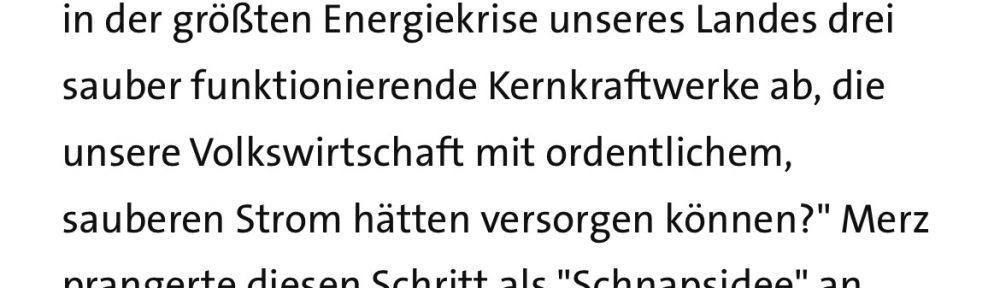 Nun müßte Mutti ihren Nicht-Sprössling eigentlich sehr deutlich tadeln, denn Merz dehnt die Wahrheit deutlich, weil Angela Merkel und das Kabinett 2011 den Atomausstieg unter dem Eindruck von Fukushima beschlossen.