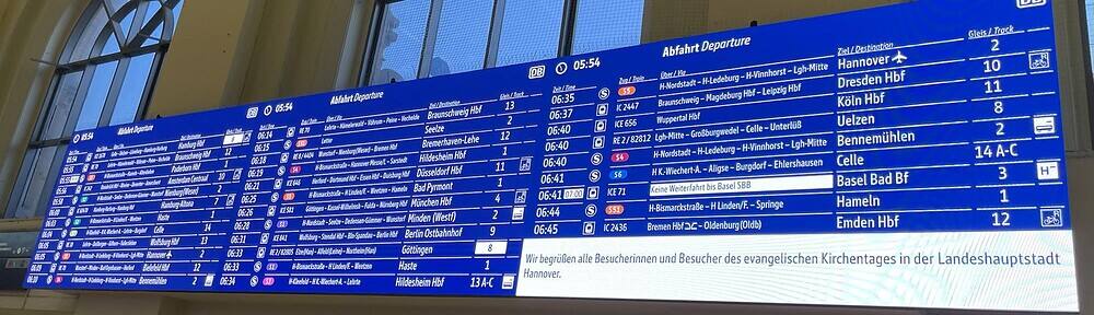 DB-Abzeigentafel im Hauptbahnhof Hannover mit Gruß an die Kirchentsgsbesucher.