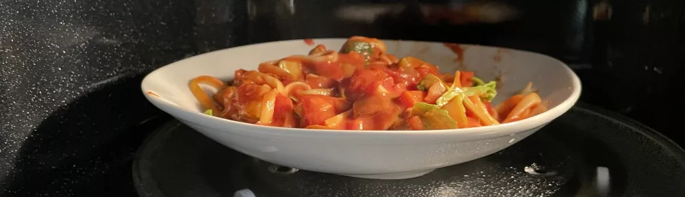 Blick in eine Drehtellermikrowelle mit weißem tiefen Teller mit Pasta ind roter Nudelsauce.