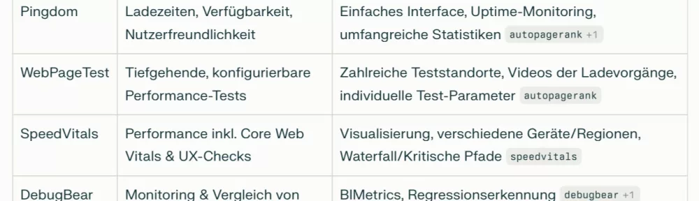 Alle genannten Alternativen bieten zusätzliche Analysefunktionen oder einen anderen Fokus (z. B. Monitoring, Vergleich mit Mitbewerbern, Wahl des Serverstandorts), die über das Angebot von PageSpeed Insights und Lighthouse hinausgehen können.