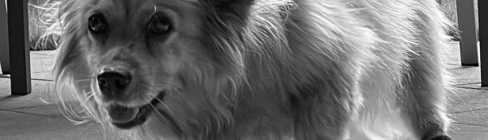 SchwarzAWeiß-Bild vom Hund Sally, auf schwartmzen Socken durch die Terassentür reinkommend.