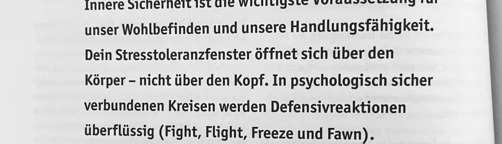 Innere Sicherheit ist die wichtigste Voraussetzung für unser Wohlbefinden und unsere Handlungsfähigkeit. Dein Stresstoleranzfenster öffnet sich über den Körper - nicht über den Kopf. In psychologisch sicher verbundenen Kreisen werden Defensivreaktionen überflüssig (Fight, Flight, Freeze und Fawn).