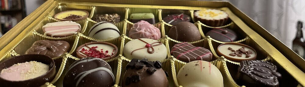 Bunte Pralinenbox mit 25 verschiedenen Pralinen.