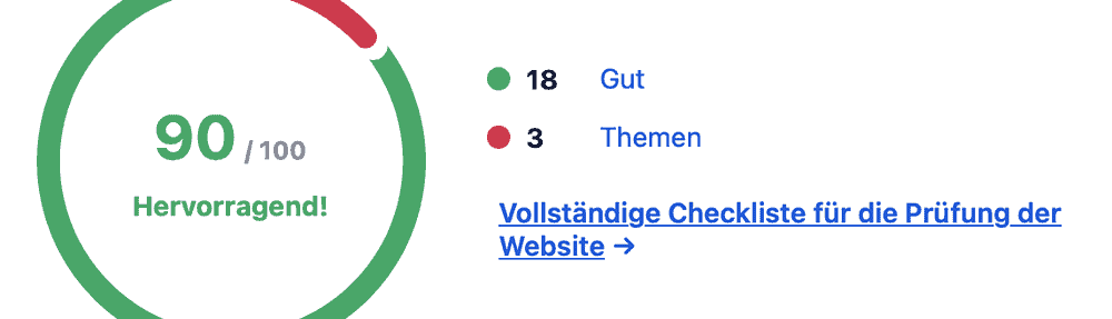 Fast grüner SEO-Kreis und mit 90/100 als hervorragend beurteilt.