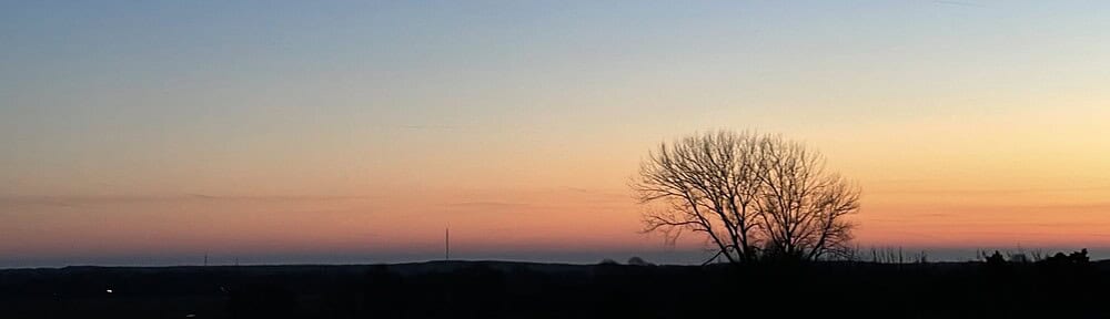 Sonnenuntergang mit schwarzem Boden, Baumgruppe rechtd und orot-orange-gelber Streifen, darüber blauer Himmel.