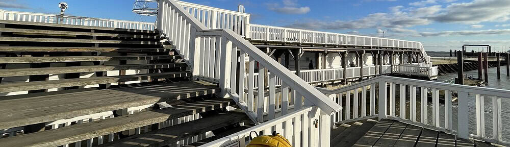 Die Alte Liebe in Cuxhaven, ein hölzerner Schiffsanleger, der weiß gestrichen idt.