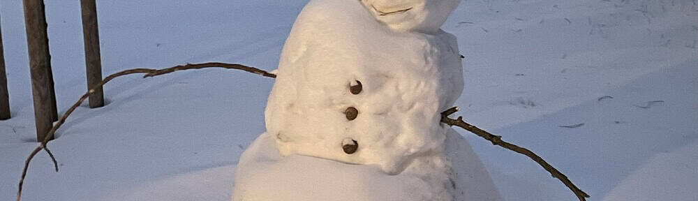 Schneemann auf Schneefeld mit langen, seitlichen Astarmen im morgendlichen Dunkel.