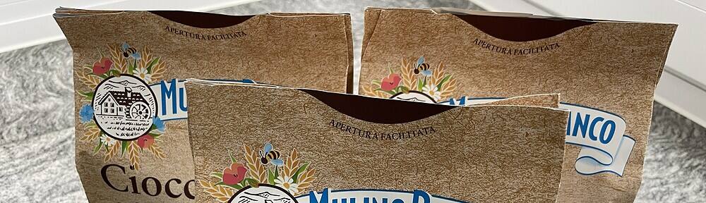 3 Pakete italienische Kekse auf der weiß-grau melierten Granitküchenarbeitsplatte