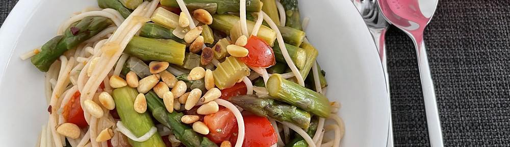 Gedeck mit Teller Spaghtti an grünem Spargel.