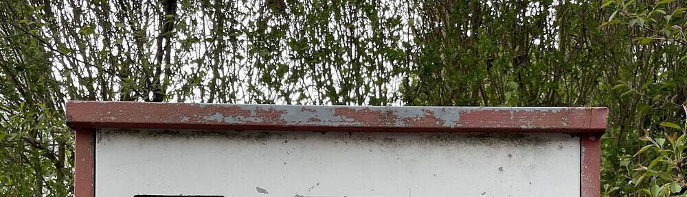 Leerer Metallautomat mit drei Senkrechten Öffnungen, die wie Ausrufezeichen aussehen - war wohl ein Kaugummiautomat